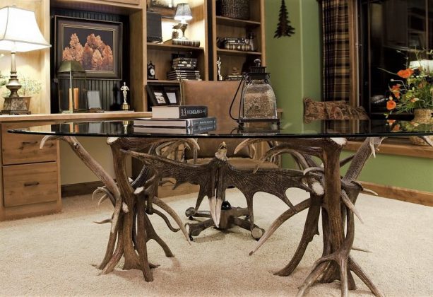 Our Roosevelt Elk Antler Desk & Chair adds a presidential rustic flair to your executive office suite with our one-of-a-kind elk antler desk and chair set. The glass-topped desk is accented by a moose-antler hand-carved into an eagle sculpture, representing the presidential seal. This antler desk includes our Roosevelt Antler Desk Chair, with upholstered in a custom leather of your choice and accented with buffalo nickel nail heads. This elk antler desk chair is a comfortable and stylistic choice with a rugged elegance fit for a president.